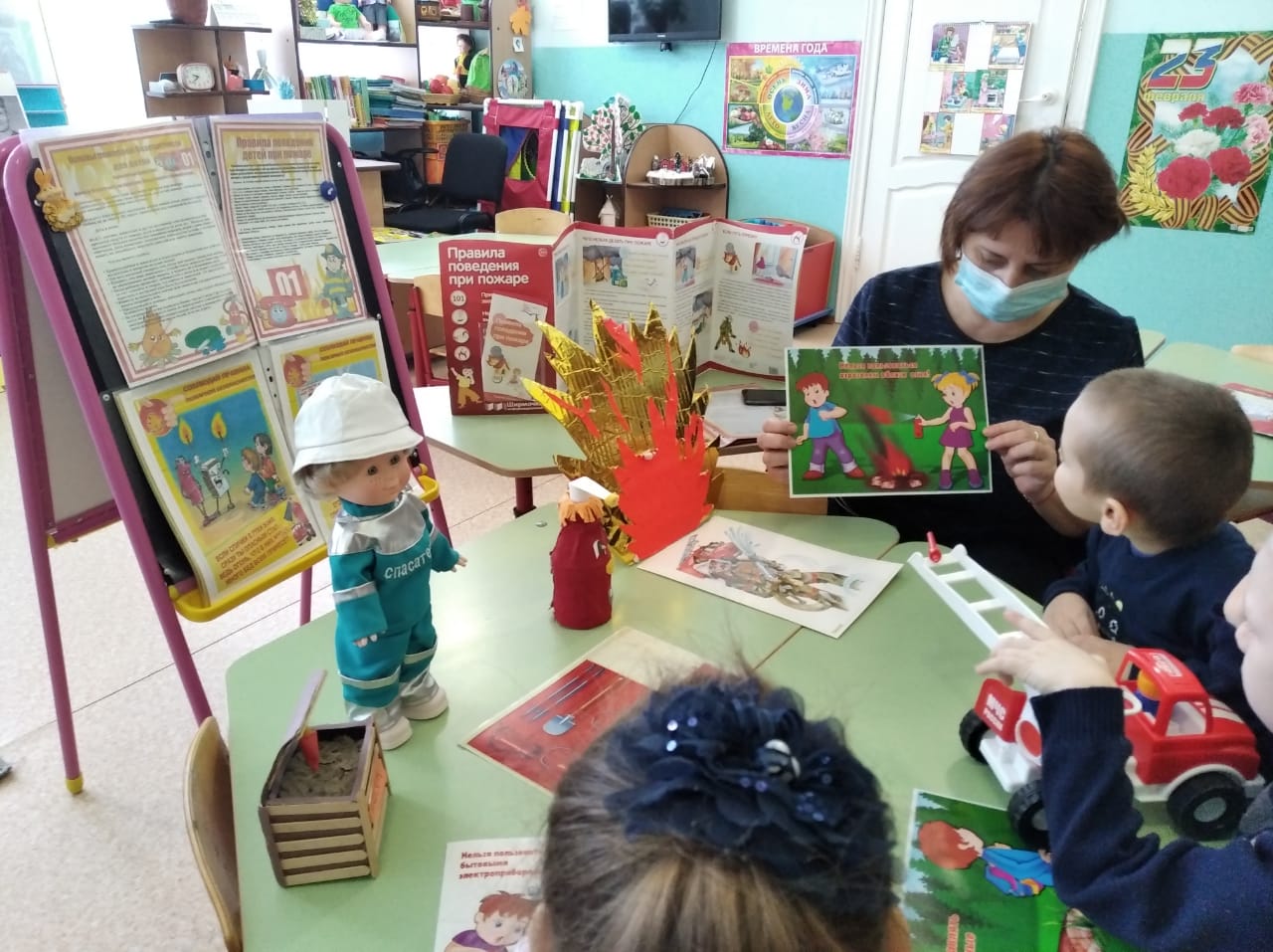 В МБДОУ детский сад “Солнышко” работа по пожарной безопасности занимает особое место в воспитательно — образовательном процессе. В связи с пожаром, который произошел в нашем селе и унес жизни двоих детей,  в каждой возрастной группе мы заострили внимание наших непосед на том, как вести себя при пожаре, какие действия могут привести к небезопасным ситуациям, почему пожары так опасны…